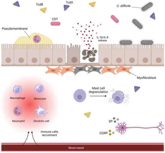 Representation of CDI-mediated inflammatory host response. Once TcdA and TcdB destroy the intestinal epithelium, they cause damage to deeper layers of tissue such as the destruction of the myofibroblasts. The presence of toxins triggers the release of dendritic cells, neutrophils, monocytes, and macrophages from the blood vessels. IL-1β and IL-8 produced by the intestinal epithelial cells enhance inflammation and attract neutrophils to the lumen of the colon. Within, neutrophils form pseudomembranes. At the same time, toxins induce the degranulation of mast cells and the release of substance P (SP) and Calcitonin gene-related peptide (CGRP) from neurons of the enteric nervous system.