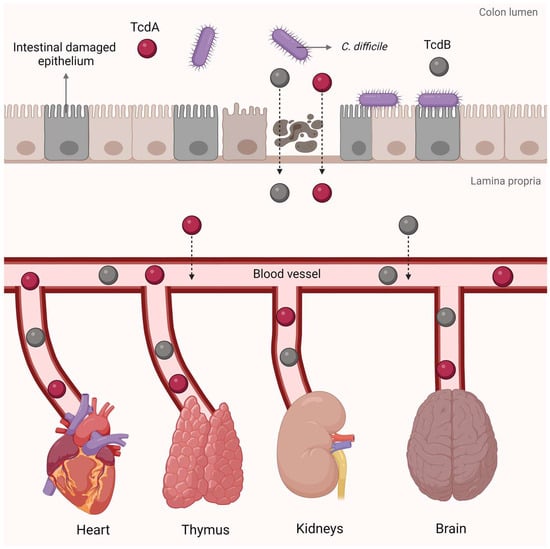 During CDI, C. difficile toxins TcdA and TcdB can breach the intestinal barrier and enter the bloodstream, resulting in systemic toxemia. Elevated levels of these toxins in the bloodstream can cause damage outside the colon, leading to dysfunction in multiple organs such as the heart, thymus, kidneys, and brain.