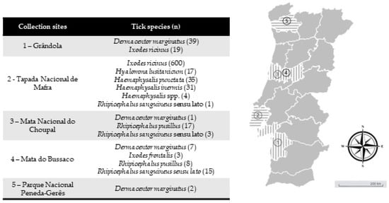- Santos-Silva, M.M.; Beati, L.; Santos, A.S.; De Sousa, R.; Núncio, M.S.; Melo, P.; Santos-Reis, M.; Fonseca, C.; Formosinho, P.; Vilela, C.; et al. The Hard-Tick Fauna of Mainland Portugal (Acari: Ixodidae): An Update on Geographical Distribution and Known Associations with Hosts and Pathogens. Exp. Appl. Acarol. 2011, 55, 85–121. [Google Scholar] [CrossRef] [PubMed]
