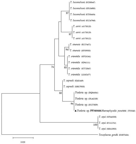 Phylogenetic tree constructed and displayed by the neighbor-joining method and Kimura’s two-parameter evolution model from partial sequences of the 18S rRNA gene. The same topographic representation was obtained by the maximum likelihood method and Kimura’s two-parameter + I + G4 evolution model from partial sequences of the 18S rRNA gene according to the BIC (Bayesian Information Criterion), as defined by IQ-TREE web server model selection. Bootstrap values were obtained from 1000 replications and are indicated at the nodes of the respective branches (only values ≥ 75%). The Theileria sp. sequence obtained during this work is highlighted with a triangle and its respective accession, both in bold format.