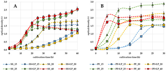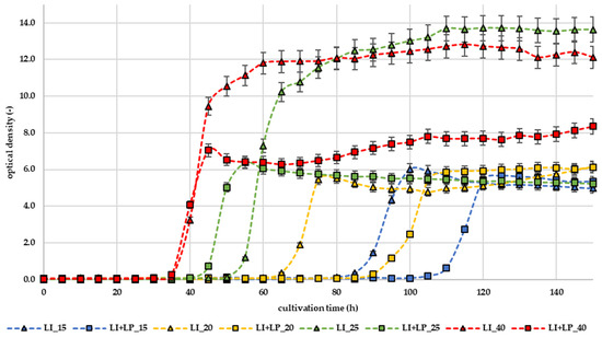 The testing was carried out at the different temperatures 15, 20, 25, and 40 °C. Figure 1 presents the results of the growth curves of L. innocua in TSB broth. It can be seen that LP has inhibitory effects, especially at lower temperatures. A significant inhibitory effect (p < 0.05) was observed at the culture temperatures of 15 and 20 °C, when the lag phase of the bacteria was prolonged for approximately 25 h. On the other hand, at higher temperatures (30 and 40 °C) bacterial growth occurred more rapidly and even at 40 °C a higher optical density was detected. Inhibitory effects at a lower temperature can also be seen in the growth curve of S. saprophyticus (Figure 2A) and P. fluorescens (Figure 2B). The lag phase of S. saprophyticus was prolonged by approximately 10 h at 15 and 20 °C. The lag phase of P. fluorescens was not prolonged; however, a slower increase in the exponential phase can be seen.