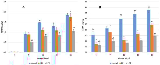 Oxidation level (MDA concentration (mg/kg) of meat products ((A)—ham, (B)—pâté) with/without the addition of LP; LP1—meat products with 0.25% of LP; LP2—meat products with 0.50% LP; a–c means statistical difference (p < 0.05) between control and LP1, respectively LP2.