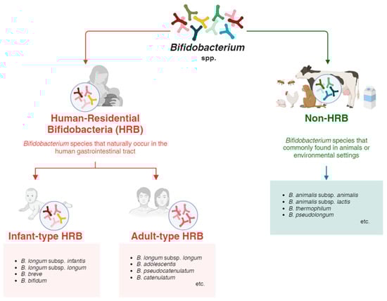 Distinctive differences in the ecological distribution of bifidobacteria. In the human host, the Bifidobacterium species that naturally occur in the human gastrointestinal tract are referred to as the human-residential bifidoabcteria (HRB). Within the HRB group, the bifidobacterial species that are prevalent in the infant gut, including Bifidobacterium longum subsp. infantis, B. breve, B. bifidum, and B. longum subsp. longum, are sub-categorized as infant-type HRB. Conversely, other bifidobacterial species that are more typically found in the intestines of adults, including B. longum subsp. longum, B. adolescentis, B. catenulatum, B. pseudocatenulatum, etc., are grouped as adult-type HRB. In contrast, bifidobacterial species that are commonly found in animals or environmental settings, including B. animalis subsp. animalis, B. animalis subsp. lactis, B. thermophilum, B. pseudologum, etc., are referred to as non-HRB species. The species of HRB and non-HRB display differences in their ecological adaptation.