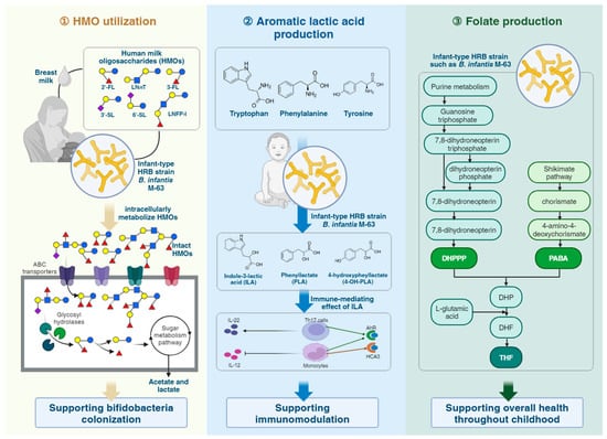 The physiological properties of Bifidobacterium longum subsp. infantis M-63 on HMO utilization and metabolite production such as aromatic lactic acids and folate. (1) M-63 demonstrates superiority in utilizing HMO compounds internally that may have enhanced its fitness and survival in the infant gut, contributing to its beneficial effect on bifidobacteria colonization. (2) M-63 is also capable of producing aromatic lactic acids including indole-3-lactic acid (ILA), phenyllactate (PLA), and 4-hydroxyphenyllactate (4-OH-PLA) that are associated with immune-modulating effects. (3) M-63 also potentially produces folate, a critical cofactor, and thereby potentially offering better-associated health benefits throughout childhood.