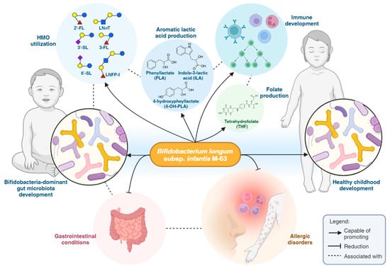 The multifaceted physiological effects of Bifidobacterium longum subsp. infantis M-63 on human milk oligosaccharide (HMO) utilization and metabolite production and its clinical benefits throughout childhood. The specialized enzymatic machinery of M-63 enables it to efficiently metabolize HMOs, promoting the development of a bifidobacteria-dominant gut microbiota and immune development in early life. The strain also produces key metabolites such as folate, which is essential for DNA synthesis, cell growth, and neurological development as well as aromatic lactic acid including phenyllactate, indole-3-lactic acid (ILA), and 4-hydroxyphenyllactate (4-OH-PLA), which are essential for immune function. Clinically, supplementation with M-63 has been shown to lead to a bifidobacteria-dominant gut microbiota, reduced gastrointestinal discomforts, reduced allergic symptoms, and healthy childhood development. Studies have demonstrated its effectiveness both as a single probiotic and in combination with other strains to support overall health status of a child.