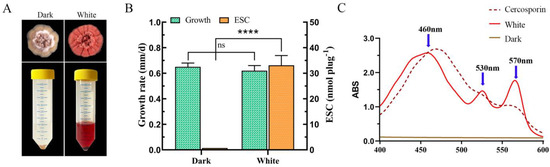 Growth and toxin production of E. arachidis. (A) Colony morphology of E. arachidis under white light and dark conditions, with ESC extracts below and fungal sediment at the bottom of the solution. (B) Measurement of mycelial growth rate and ESC content under white light and dark conditions. Growth rate is calculated as colony diameter divided by days of growth, and ESC content is derived from a regression equation. The ns and **** represent the analysis of the significance of the within-group differences. ns indicates that the difference is not significant and **** means that the p-value is less than 0.0001. (C) Absorption spectrum of ESC extract displaying a peak between 400 and 600 nm. The dashed line represents cercosporin; the solid red line shows the ESC absorption peak under white light conditions and the solid yellow line under dark conditions.