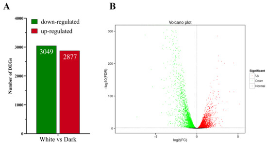 Analysis of differentially expressed genes (DEGs) in E. arachidis. (A) Differential upregulation and downregulation of genes. (B) Gene expression differences between white and dark conditions in E. ararchidis.