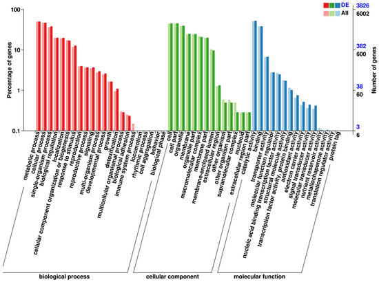GO annotations of differentially expressed genes in E. arachidis. The red section represents the Biological Process (BP), the green section represents the Cellular Component (CC), and the blue part represents the Molecular Function (MF). DE is the number of upregulated genes within a secondary classification, ALL is the number of all differential genes within that classification, and the two colors are related to the value of the right y.