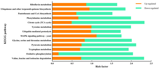 KEGG pathway analysis of transcriptomic DEGs. The y-axis indicates the function of the genes, with orange–yellow representing the number of upregulated genes and green representing the number of downregulated genes.