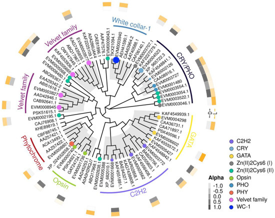 - Corrochano, L.M. Light in the Fungal World: From Photoreception to Gene Transcription and Beyond. Annu. Rev. Genet. 2019, 53, 149–170. [Google Scholar] [CrossRef]