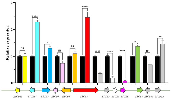 E. arachidis secondary metabolism gene clusters and gene expression under white light conditions. Black represents gene expression under dark conditions, and color represents gene expression under white light conditions. The upper part represents the gene expression level, the lower part represents the gene cluster and below the gene cluster is the gene name. Among them, ESCB1 has the highest level under light conditions. The ns, *, ** and **** represent the analysis of the significance of the within-group differences. ns indicates that the difference is not significant, * means that the p-value ≤ 0.05, ** means that the p-value ≤ 0.01 and **** means that the p-value is less than ≤0.0001.