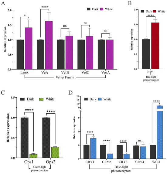 RT-qPCR analysis of candidate genes. (A). Expression levels of Velvet complex genes (LaeA, VeA, VelB, VelC, and VosA) under white light and dark conditions. (B). Expression level of the red-light receptor gene PHY1 under white and dark conditions. (C). Expression levels of the green light receptor genes Ops1 and Ops2 under white and dark conditions. (D). Expression levels of the blue light receptor gene WC1 and photolyase genes CRY1, CRY2, CRY3, and CRY4 under white and dark conditions. The ns, * and **** represent the analysis of the significance of the within-group differences. ns indicates that the difference is not significant, * means that the p-value ≤ 0.05 and **** means that the p-value is less than ≤0.0001.