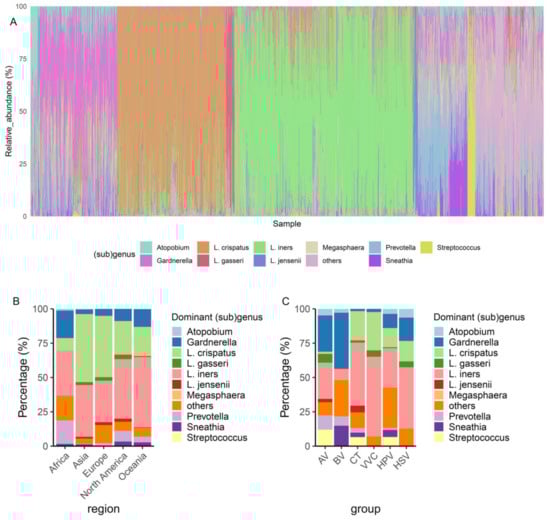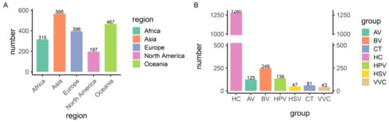 We collected 2017 sequencing data of the 16S rRNA gene of vaginal swabs from 14 studies to characterize the vaginal microbiota of women of a reproductive age (Table 1), including samples from healthy controls and aerobic vaginitis (AV), bacterial vaginosis (BV), vulvovaginal candidiasis (VVC)-, Chlamydia trachomatis (CT)-, human papilloma virus (HPV)-, and herpes simplex virus (HSV)-infected individuals from different continents. After sequencing quality assessment, a set of 1941 samples was selected for further analysis, including 315 samples from Africa, 566 from Asia, 396 from Europe, 197 from North America, and 467 from Oceania (Figure 1A,B).