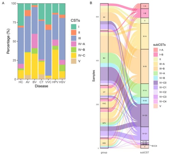 Overview of the CSTs in the vaginal microbiota. (A) The CSTs of the vaginal microbiota in each sample. (B) The distribution of CST subtypes in each disease group. HC, healthy control; AV, aerobic vaginitis; BV, bacterial vaginosis; VVC, vulvovaginal candidiasis; CT, Chlamydia trachomatis; HPV, human papilloma virus; HSV, herpes simplex virus.