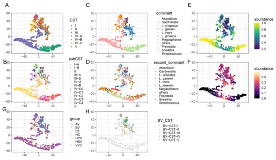t-SNE plot of microbiome samples. Samples are colored according to the CSTs (A), 13 subtypes of CSTs (B), dominant taxa (C), second most dominant taxa (D), abundance of the dominant taxa (E), abundance of the second most dominant taxa (F), disease group (G), and CSTs of the BV samples (H). AV, aerobic vaginitis; BV, bacterial vaginosis; VVC, vulvovaginal candidiasis; CT, Chlamydia trachomatis; HPV, human papilloma virus; HSV, herpes simplex virus.