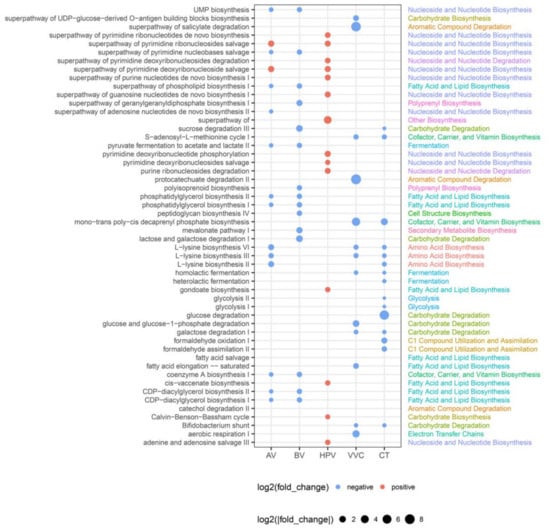 Differential functional pathways between the disease group and healthy controls. The size of the dot represents |log2(fold change)|. If the dots are red, the pathway is upregulated in the disease group. If the dots are blue, the pathway is downregulated in the disease group. Only pathways with p < 0.05 are shown. AV, aerobic vaginitis; BV, bacterial vaginosis; VVC, vulvovaginal candidiasis; CT, Chlamydia trachomatis; HPV, human papilloma virus.