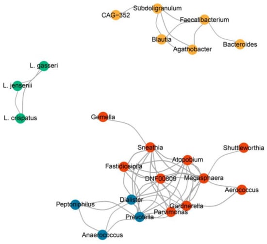 Co-occurrence network of the vaginal microbiota. Four modules of the correlated vaginal microbiota were identified: L. crispatus (green), Gardnerella (red), Prevotella (blue), and Bacteroides (yellow) modules. The line thickness represents the degree of correlation. Only correlations between subgenera with |r > 0.4| and p < 0.05 are shown.