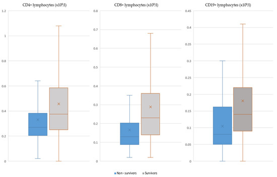 Illustration (box plots) of the distribution of the number of lymphocytes expressing the CD feature (CD4+ T lymphocytes, CD8+ T lymphocytes, and CD19+ lymphocytes) in non-surviving and surviving patients with COVID-19. Boxes—the middle part of each box represents the median (50th percentile) of the lymphocyte count. The upper and lower limits of each box represent the 25th and 75th percentiles, respectively. The lines extending from each box (whiskers) represent the range of the data.