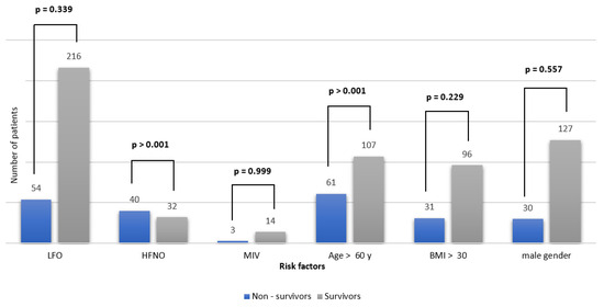 Within the monitored groups of patients, various risk factors and their influences on mortality were analyzed. Table 4 summarizes the monitored risk factors, their demographics, and their relationship with the mortality of hospitalized patients. Also the monitored risk factors, and their relationship with the mortality of hospitalized patients is described in Chart 2 and Chart 3. In the case of oxygen treatment, we found that LFO was not a risk factor for death (p = 0.339; RR = 0.73; OR = 0.66), nor was MV (p = 0.999; RR = 0.84; OR = 0.81). However, oxygen therapy with HFNO proved to be a significant risk factor for death (p < 0.001; RR = 5.73; OR = 11.65).