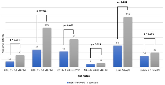 Among the selected inflammatory parameters, the following were identified as risk factors associated with the death of hospitalized patients: IL-6 levels above 50 ng/L (p < 0.001; RR = 7.96; OR = 10.89), lactate levels above 3 mmol/L (p < 0.001; RR = 3.13; OR = 4.76), and Ne/Ly indexes above 6 (p = 0.001; RR = 8.47; OR = 11.34).