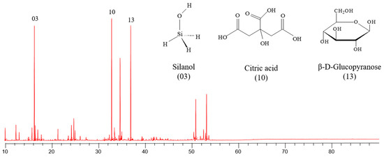 The chromatographic profile of the L. rhamnosus LR-32 postbiotic is presented in Figure 1. The majority of species in the sample are silanol (03), citric acid (10), and β-D-glucopyranose (13), thus exerting a greater influence on the characteristics of the postbiotic. In addition to these, other compounds present were α-D-galactopyranose, lactose, and maltose, showing the great abundance of sugars in the sample.