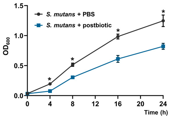 Effect of L. rhamnosus LR-32 postbiotic on the growth of S. mutans determined by optical density (OD at 600 nm); * p < 0.05.