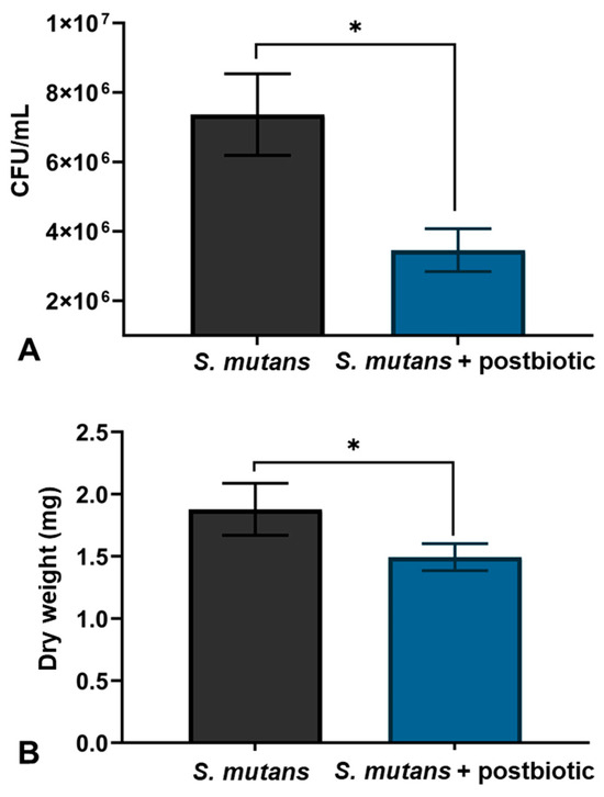 (A) Count of viable bacteria in S. mutans biofilms (CFU/mL) formed with and without the postbiotic L. rhamnosus LR-32. (B) Dry weight of S. mutans biofilms formed (mg) with and without the postbiotic L. rhamnosus LR-32. The vertical bars indicate the standard deviation; * p < 0.05.