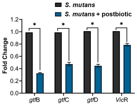 Relative gene expression (mean ± SD of foldchange) of the gtfB, gtfC, gtfD, and VicR genes of S. mutans with and without treatment with the postbiotic of L. rhamnosus LR-32 by RT-PCR; * p < 0.05.