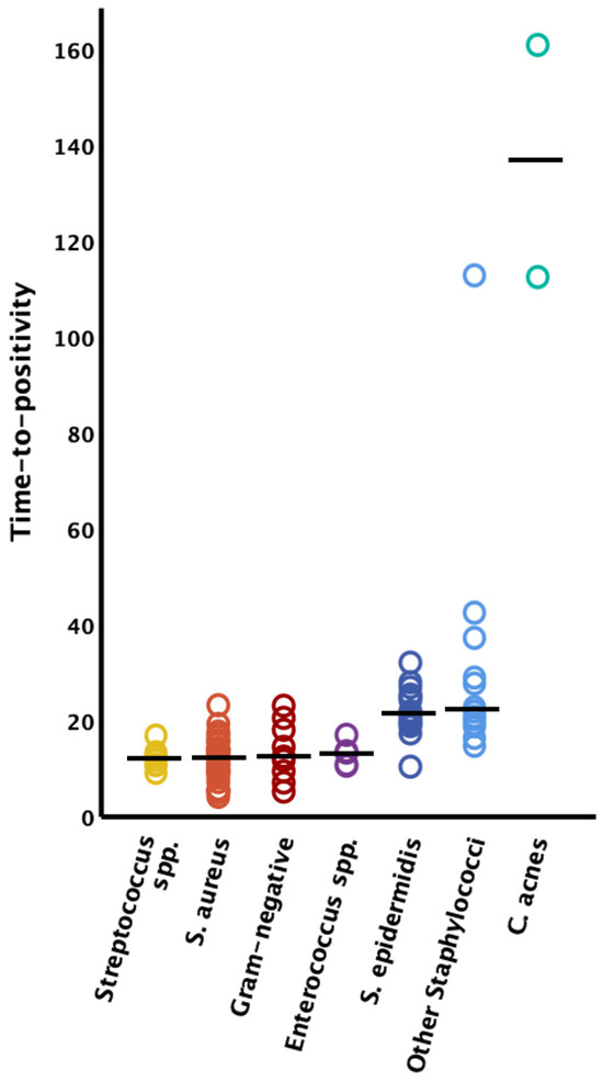 - Streptococcus species, Staphylococcus aureus, and Gram-negative bacteria exhibited the shortest time to positivity (TTP) in our cohort, with 100% of these microorganisms being detected within 48 h after inoculation.