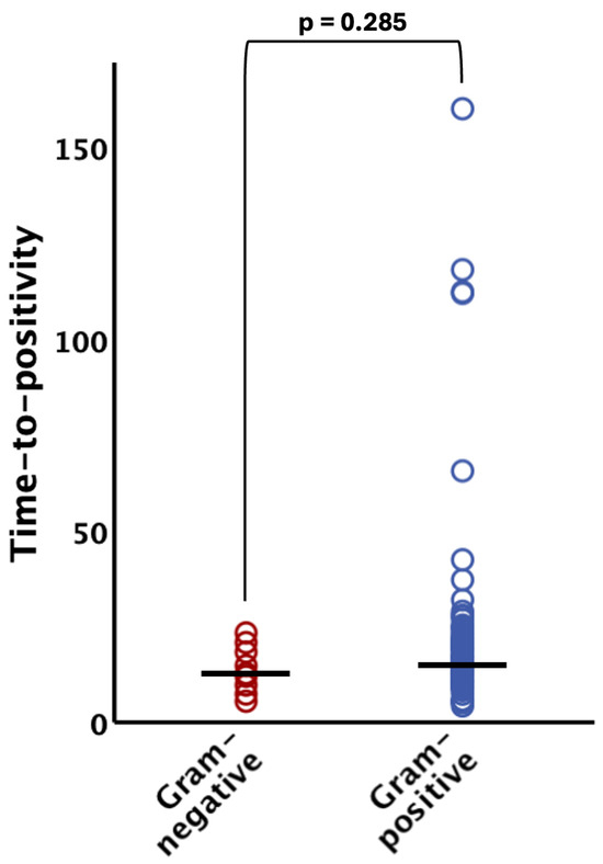- Hamilton, F.; Evans, R.; Ghazal, P.; MacGowan, A. Time to Positivity in Bloodstream Infection Is Not a Prognostic Marker for Mortality: Analysis of a Prospective Multicentre Randomized Control Trial. Clin. Microbiol. Infect. 2022, 28, 136.e7–136.e13. [Google Scholar] [CrossRef]