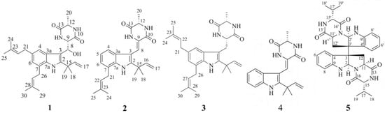 Compound 4: Yellow powder, ESI–MS m/z: 346 [M + Na]+. Based on the NMR characterization (Table S3), combined with previous reports [18], compound 4 was identified as neoechinulin A.