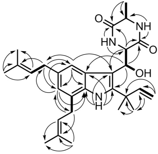 The correlation of H-8 (δH 5.46) with C-2 (δC 143.1), C-3 (δC 106.1), C-3a (δC 126.8), C-9 (δC 56.0), and C-10 (δC 170.1) and the correlation of 8-OH (δH 4.95) with C-3, C-8 (δC 69.4), and C-9 in HMBC verified the above speculation. Further analysis of 2D NMR (Figure 2) provided further validation of the overall structure. Firstly, the HMBC correlation of H-4 (δH 7.41) with C-3a, C-3, C-6 (δC 123.1), C-7a (δC 132.6), and C-21 (δC 34.7), the HMBC correlation of H-6 (δH 6.79) with C-4 (δC 117.2), C-7a, C-21, and C 26 (δC 31.5), the HMBC correlation of H-21 (δH 3.37) with C-4 (δC 117.2) and C-6, the correlation of H-26 (δH 3.37) with C-6 and C-7a, and the HMBC correlation of 1-NH (δH 8.15) with C-2, C-3, C-3a, and C-7a verified the structural fragment of the indole parent nucleus and the substitution position of the isopentenyl group on the benzene ring. Secondly, the HMBC correlation of H-18 (δH 1.52) with C-2, C-15 (δC 38.7), C-16 (δC 145.6), and C-19 (δC 28.3), the HMBC correlation of H-17 (δH 5.21, 5.15) with C-15 and C-16, and the 1H-1H COSY correlation of H-16 (δH 6.12) with H-17 verified the structural fragment with the two-position substituent. Thirdly, the HMBC correlation of H-9 (δH 4.66) with C-10 and C-13, the HMBC correlation of 11-NH (δH 5.34) with C-9, C-12, and C-13, the HMBC correlation of 14-NH (δH 6.14) with C-9 and C-13, the HMBC correlation of H-20 (δH 1.51) with C-12 (δC 50.6) and C-13 (δC 167.0), and the 1H-1H COSY correlation of H-20 with H-12 (δH 4.13) validated the structural unit of diketopiperazine. In addition, the HMBC correlation of H-9 with C-3, the HMBC correlation of H-8 with C-2, C-3, C-3a, and C-10, and the COSY correlation of H-8 with H-9 validated the connection method from C-3 to C-8 and then to C-9. Finally, the HMBC correlation of H-24 (δH 1.73) with C-22 (δC 124.6), C-23 (δC 131.4), and C-25 (δC 25.8), the 1H-1H COSY correlation of H-21 with H-22, the HMBC correlation of H-29 (δH 1.88) with C-27 (δC 123.0), C-28 (δC 132.0), and C-30 (δC 25.7), and the 1H-1H COSY correlation of H-26 with H-27 verified the structural units of the two isopentenyl groups. In summary, the structure of compound 1 was established (Figure 1(1)) and named 8-hydroxyechinulin.