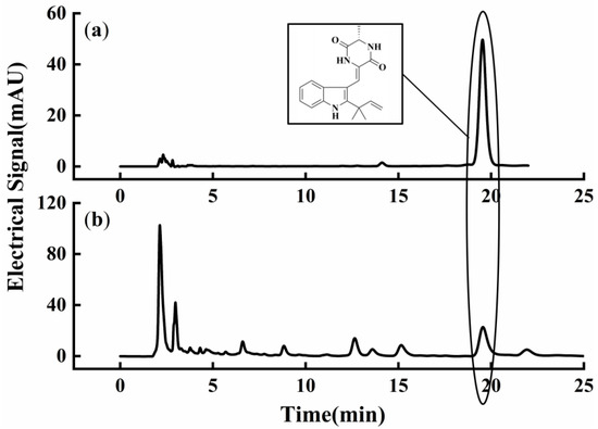 HPLC chromatograms. (a) Neoechinulin A standard, (b) A. amstelodami BSX001 fermentation sample.
