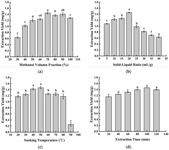 Single-factor optimization tests were conducted sequentially for methanol volume fraction, solid–liquid ratio, soaking temperature, and ultrasound time. The initial conditions of extraction were 100% methanol volume fraction, solid–liquid ratio of 20 mL/g, soaking temperature of 20 °C, and ultrasound time of 120 min.