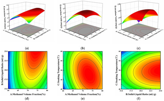 Effect of methanol volume fraction (A), solid–liquid ratio (B), and soaking temperature (C) on the extraction yield of neoechinulin A. Response surface plots (a–c) and contour plots (d–f) showed the effects of methanol volume fraction, solid–liquid ratio, and soaking temperature on the extraction yield of neoechinulin A.