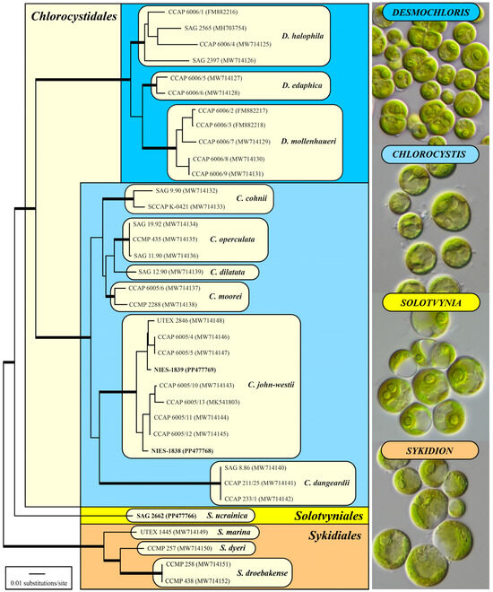 As demonstrated above, the newly investigated strains belong to three different genera. The strains NIES-1838 and NIES-1839 represent new isolates of Chlorocystis john-westii, which has been confirmed by molecular analyses and morphological observations. The strain SAG 2662 (= ULVO-129) represents a new genus and order as demonstrated by phylogenetic analyses, its ITS-2 secondary structure, and its morphology (for a comparison to other coccoid and sarcinoid genera, see Table S3). The strain CCMP-1293 is almost identical in terms of its SSU and ITS rDNA sequences to Symbiochlorum hainanense. However, it differs in its morphology and reproduction from the original description by Gong et al. [13]. As a consequence of our study, we formally revise this generic and species description and propose the following new order and genus.