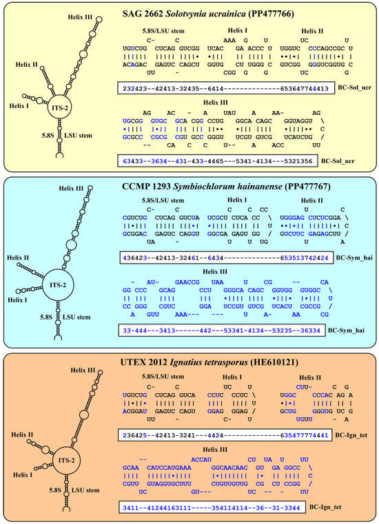 The structures and ITS-2 barcodes delineated using the conserved region of ITS-2 are given in Figure 3. The barcodes differ from those of the other coccoid members of the ulvophytes and we found compensatory base changes in the conserved region of ITS-2. A comparison of the Solotvynia barcode to the species of Desmochloris, Chlorocystis, and Sykidion highlighted eleven CBCs/HCBCs (highlighted in blue in Figure 3). The ITS-2 sequences of Symbiochlorum hainanense and Ignatius tetrasporus differ in many bases, particularly Helix III.