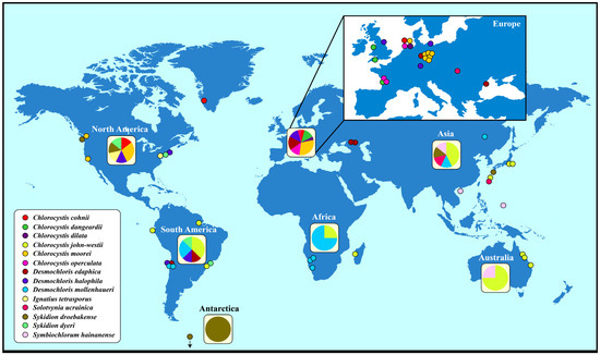 Distribution of the coccoid and sarcinoid green algae belonging to the Ulvophyceae around the world. The geographical origin of Sykidion marina is unknown.
