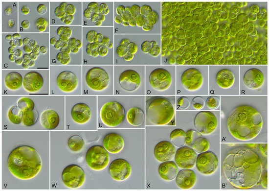 Morphology and phenotypic plasticity of Solotvynia ucrainica (SAG 2662) grown on SWES medium. (A). Quadriflagellated zoospores; (B,C). Young vegetative cells; (D–I). Tetrad formation; (J). Parenchyma-like crust; (K–N). Vegetative cells with cup-shaped chloroplasts; (O–X). Mature cells of different ages with reticulated chloroplasts; (Y–B′). Old cells with reticulated chloroplasts and numerous vacuoles. Scale bar = 10 µm.