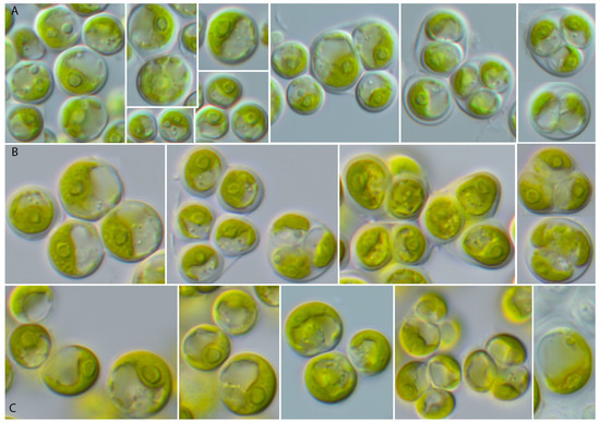 The vegetative cells of SAG 2662 showed a spherical morphology at all ages (Figure 5). They form tetrads, which stick together to form a parenchyma-like crust (Figure 5J). The chloroplasts are cup-shaped (Figure 5K–N) similar to Chlorocystis and become reticulated with age (Figure 5O–B’). The chloroplasts contain single or sometimes two pyrenoid(s) (Figure 5L). The zoospores are quadriflagellated (Figure 5A). As shown in Figure 1, this strain is similar to the strain MBIC 10461 in our analysis. Unfortunately, the morphology of that strain cannot be compared because the strain is currently not available in public culture collections. The ecology of both strains differs. SAG 2662 originated from a hypersaline lake, whereas the strain MBIC 10461 was isolated from the open sea. To test if the strain SAG 2662 can survive in other conditions, we cultivated it on freshwater, brackish, and hypersaline media (see Section 2). In our experiment, which lasted for four weeks, the strain survived all conditions and showed only minor morphological variations (Figure 6).