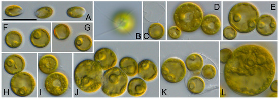 Morphology and phenotypic plasticity of Symbiochlorum hainanense (CCMP 1293) grown on SWES medium. (A). Zoospores shortly after settlement; (B). Quadirflagellated zoospore; (C,F,G). Young cells shortly after settlement with eye spot and empty sporangium cell wall; (D,E,H,I). Vegetative cells in apical and middle sections showing the structure of chloroplast; (J–L). Vegetative cells of different age. Scale bar = 10 µm.