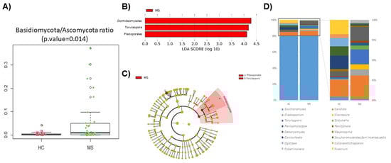 Comparison of the patients’ (MS) and controls’ (HC) mycobiota. (A) Box plot showing Basidiomycota/Ascomycota ratio between HC and MS. (B) Linear discriminant analysis (LDA) analysis showing differentially abundant bacterial groups as biomarkers determined using the Kruskal–Wallis test (p < 0.05) with an LDA score > 2.0. The plotted data represent the microbial differences between in the MS patients (red) and healthy controls. (C) Cladogram plotted for the studied population’s mycobiota. Cladograms show the different taxonomic levels by rings; the root of the cladogram denotes the domain fungi, and phyla are represented in the inner ring and genus in the outer one. The plotted data represent the microbial differences between the MS patients (red) and healthy controls. (D) Bar plot of the top 10 genera in HC and MS samples, and expansion of the less abundant genera on the right bar plot (note: where resolution at the genus level was not possible, taxa are described at the family level).