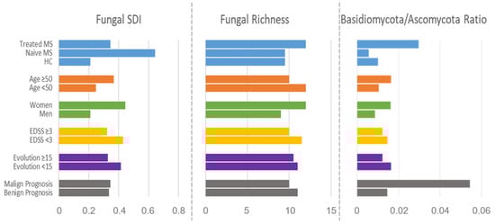 DMTs affected both fungal richness (10.7 groups) and diversity (SDI = 0.34) compared to naïve patients (10.6 groups and SDI = 0.64), even though they did not reach the levels of the HCs (9.7 groups and SDI = 0.21). The Basidiomycota/Ascomycota ratio was also modified by DMTs, reversing the trend observed in naïve MS. Other variables that influence the mycobiota composition measured by the fungal SDI and richness, and Basidiomycota/Ascomycota ratio were age, sex, EDSS, years of disease evolution, and disease prognosis (Figure 2).