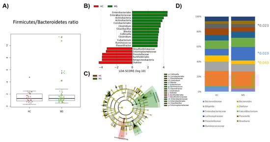 Comparison of patients’ (MS) and controls’ (HC) bacterial microbiota. (A) Box plot showing the ratio of Firmicutes to Bacteroidetes between the HCs and MS. (B) Linear discriminant analysis (LDA) showing the differentially abundant bacterial groups as biomarkers determined using the Kruskal–Wallis test (p < 0.05) with an LDA score > 2.0. The plotted data represent the microbial differences between the MS patients (green) and healthy controls (red). (C) Cladogram plotted of the studied population’s microbiota. Cladograms show the different taxonomic levels by rings; the root of the cladogram denotes the domain bacteria, and phyla are represented in the inner ring and genus in the outer one. The plotted data represent the microbial differences between the MS patients (green) and healthy controls (red). (D) Bar plot of the top 10 genera in the HC and MS samples (note: where resolution at the genus level was not possible, taxa are described at the family level). Significant differences were indicated with *.