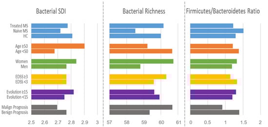 DMTs increased diversity (SDI = 2.77) and bacterial richness (17 groups) in the gut of treated patients compared to those that were naïve (SDI = 2.69 and 57.8 groups), reaching levels similar to those observed in the controls. The Firmicutes/Bacteroidetes ratio was also modified by DMTs, reversing the trend observed in naïve MS. Other variables that influenced the bacterial composition measured by the SDI and richness, and the Firmicutes/Bacteroidetes ratio were age, sex, EDSS, years of disease evolution, and disease prognosis (Figure 4).