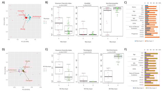 Stratification of the studied population in mycotypes based on their gut mycobiome. (A) Scatter plot representing the mycotypes identified among the studied population. Clustered samples are represented in different colors, and the fungal groups that had a higher influence on the samples are represented by arrows. The bidimensional PCoA plot explains 46.9% of the sample’s variability. (B) The Shannon diversity index and fungal group abundance box plots showing the main contributors of each mycotype. (C) Influence of demographic and clinical factors on the gut fungal profile within each mycotype. (D) Scatter plot representing the MS mycotypes identified among the studied population. Clustered samples are represented in different colors, and the fungal groups that had a higher influence on the patient samples are represented by arrows. The bidimensional PCoA plot explains 26.9% of the sample’s variability. (E) The Shannon diversity index and fungal genus abundance box plots showing the main contributors to each MS mycotype. (F) Influence of demographic and clinical factors on the gut fungal profile within each MS mycotype.