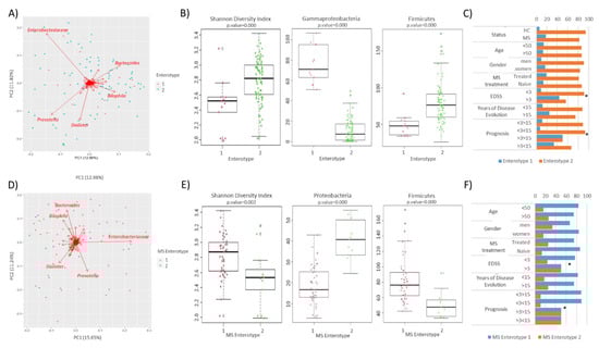 Stratification of the studied population in enterotypes based on their gut microbiome. (A) Scatter plot representing the enterotypes identified among the studied population. Clustered samples are represented in different colors, and the bacterial groups that had a higher influence on the samples are represented by arrows. The bidimensional PCoA plot explains 24.8% of the sample’s variability. (B) The Shannon diversity index and bacterial group abundance box plots showing the main contributors to each enterotype. (C) Influence of demographic and clinical factors on the gut microbial profile within each enterotype (* Fisher’s exact test p < 0.05). (D) Scatter plot representing the MS enterotypes identified among the studied population. Clustered samples are represented in different colors, and the bacterial groups that had a higher influence on the patient samples are represented by arrows. The bidimensional PcoA plot explains 26.9% of the sample’s variability. (E) The Shannon diversity index and bacterial group abundance box plots showing the main contributors to each MS enterotype. (F) Influence of demographic and clinical factors on the gut microbial profile within each MS enterotype (* Fisher’s exact test p < 0.05).
