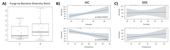 (A) Boxplot of the fungi-to-bacteria ratio in the HC and MS patients. (B) Correlation of the main fungal phylum Ascomycota and the main bacterial phyla Firmicutes (upper figure) and Proteobacteria (lower figure) in the HCs. (C) Correlation of the same dominant fungal and bacterial phyla comparing the HC and the MS patient samples.