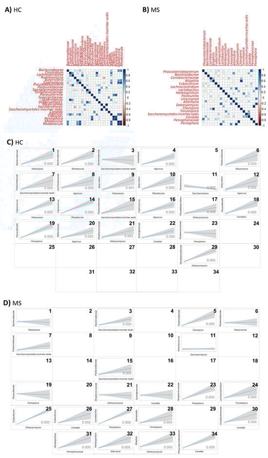 Correlation between the main fungal and bacterial groups (present in at least 10% of the samples and in at least 0.1% on average) in the (A) HCs and (B) MS. Comparison of the significant correlations between the main fungal and bacterial groups in the (C) HCs and (D) MS (note: microbial groups not present in 10% of the samples and/or under 0.1% on average were nor represented). 1. Bacteroidaceae Malassezia correlation; 2. Bacteroidaceae Rhodotorula correlation; 3. Bacteroidaceae Saccharomycetales incertae sedis correlation; 4. Clostridium Agaricus correlation; 5. Pasteurellaceae Clavispora correlation; 6. Pasteurellaceae Meyerozima correlation; 7. Pasteurellaceae Saccharomycetales incertae sedis correlation; 8. Lachnospiraceae Agaricus correlation; 9. Butyrivibrio Malassezia correlation; 10. Butyrivibrio Rhodotorula correlation; 11. Ruminococcus Saccharomyces correlation; 12. Butyrivibrio Agaricus correlation; 13. Coprococcus Malassezia correlation; 14. Coprococcus Rhodotorula correlation; 15. Parasutterella Saccharomycetales incertae sedis correlation; 16. Coprococcus Agaricus correlation; 17. Pseudobutyrivibrio Debaryomyces correlation; 18. Parasutterella Trametes correlacion; 19. Parasutterella Peniophora correlation; 20. Akkermansia Agaricus correlation; 21. Streptococcaceae Debaryomyces correlation; 22. Synergistaceae Candida correlation; 23. Streptococcaceae Peniophora correlation; 24. Lachnoclostridium Torulaspora correlation; 25. Eubacterium Debaryomyces correlation; 26. Eubacterium Candida correlation; 27. Lactobacillus Peniophora correlation; 28. Barnesiella Torulaspora correlation; 29. Spiroplasmataceae Debaryomyces correlation; 30. Coriobacteriaceae Candida correlation; 31. Herbaspirillum Peniophoraceae correlation; 32. Herbaspirillum Alternaria correlation; 33. Bilophila Debaryomyces correlation; 34. Phascolarctobacterium Candida correlation.