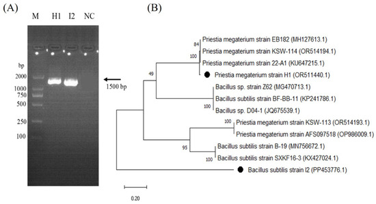 Figure 1. (A) I6S rRNA gene PCR detection of P. megaterium H1 and B. subtilis I2. (B) Phylogenetic tree of partial 16S rRNA gene sequences of antagonistic bacteria along with the sequences from selected references strains. The analysis was conducted with MEGA 11 using a neighbor-joining method. Note: M: DL2000 DNA marker, H1: P. megaterium, I2: B. subtilis, NC: negative control.